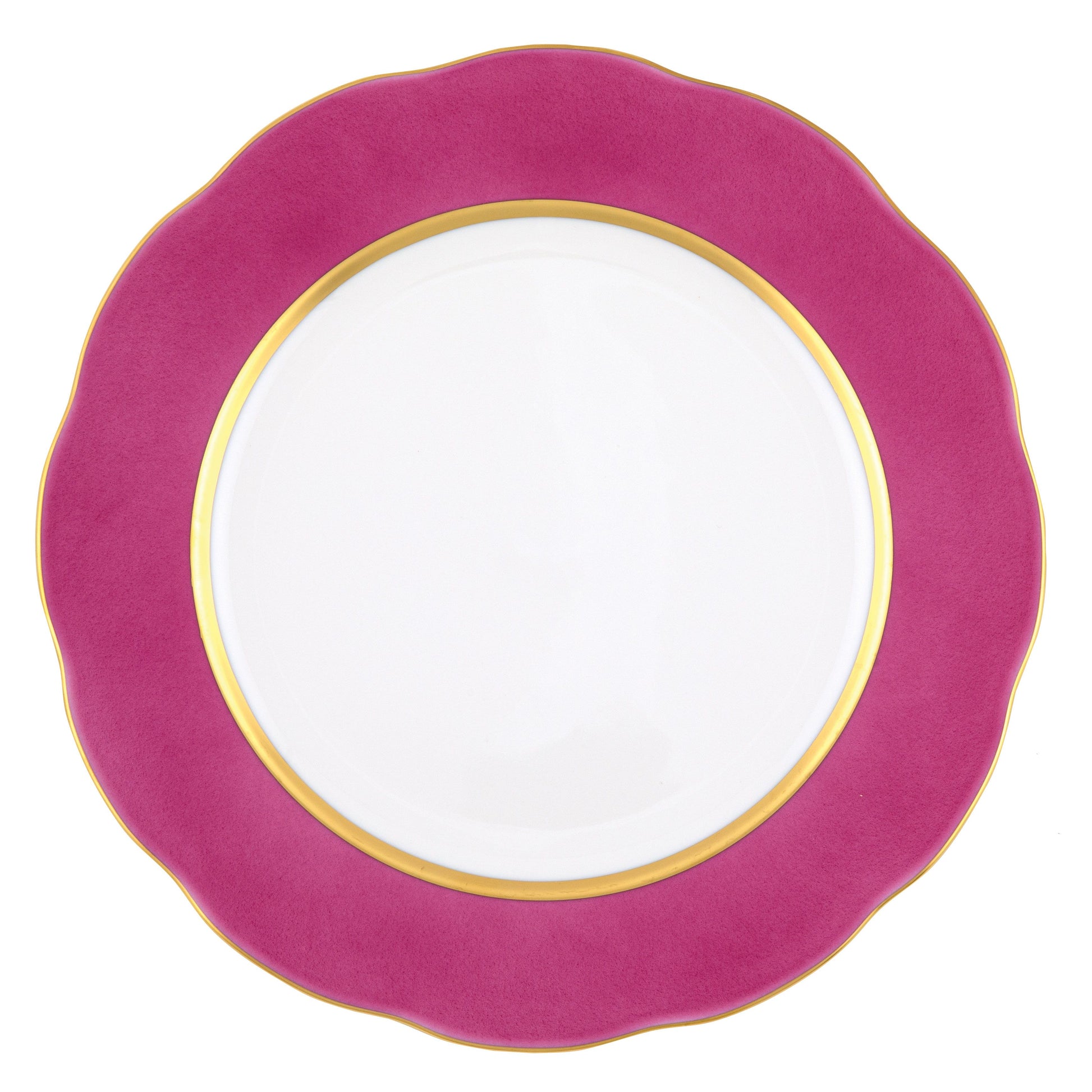 The Herend Silk Ribbon collection features a solid color border with gold detailing around the inner and outer rim and a scalloped shape. This versatile pattern can easily be paired with other collections or used on its own. Hand wash recommended and not microwave safe.