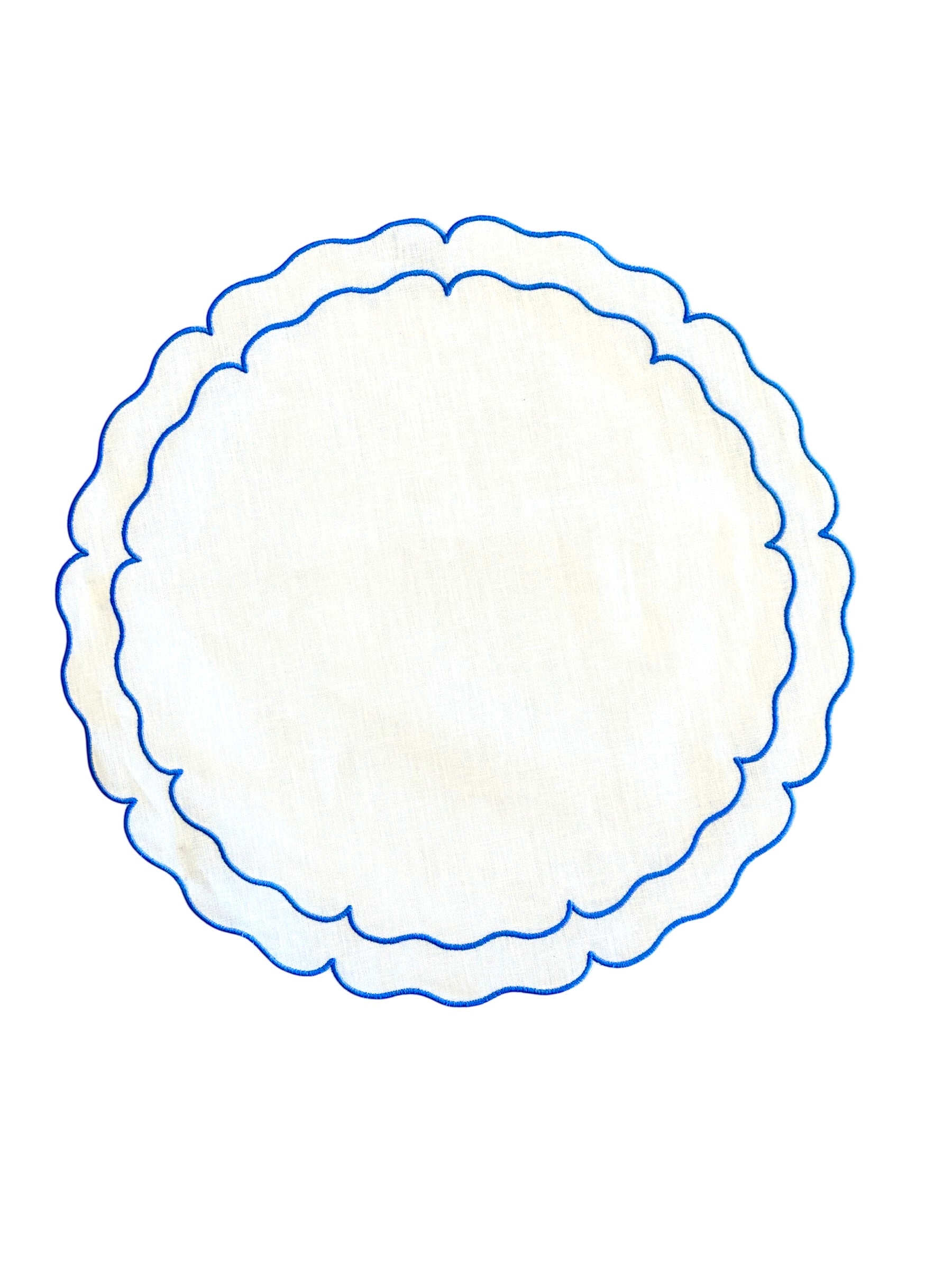 Set of 6 Scalloped Rectangular White and Blue Placemats