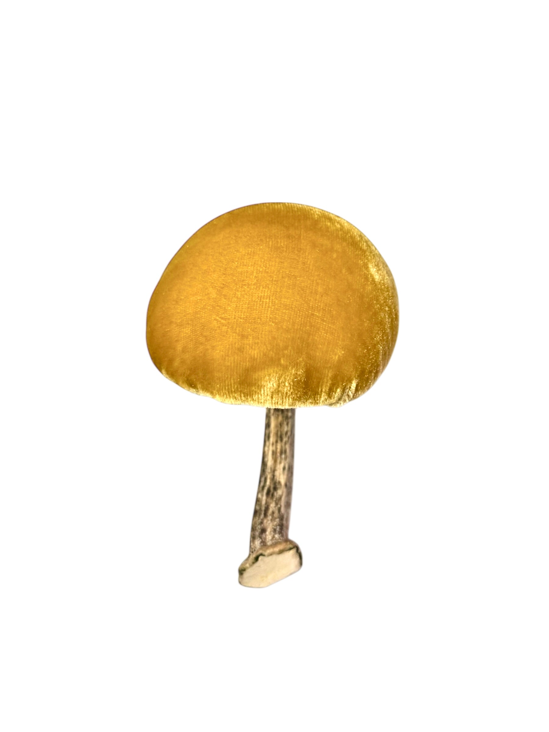 Silk velvet mushroom. Finished with a natural pumpkin stem. Handmade in Oregon by a Hot Skwash artisan. Each piece is hand signed in gold.